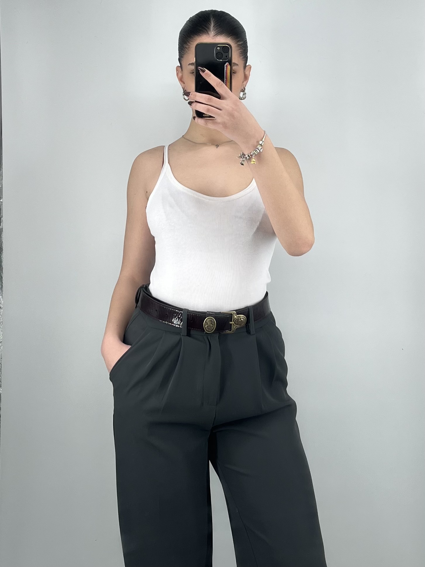 Χειροποίητη βινύλ ζώνη με μεταλλική σκαλιστη αγκράφα. Φοριέται κανονικά ή δεμένη χαλαρά με δήθεν κόμπο στο τελείωμα,ψηλόμεσα ή χαμηλόμεσα